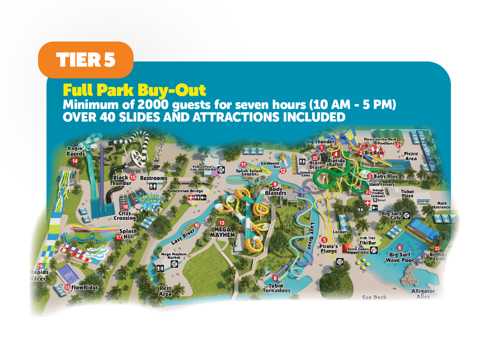 Additional tickets above the minimum allotment may be purchased at a discounted rate. Admission for each guest is only valid during the allotted time period for rental. All day admission to Rapids is not included with the above private events, except the full park buy-out. If your group wishes to stay in the park during regular operating hours on the day of your visit, there will be an additional fee for that admission. All park buy-out packages must be booked at least 4 weeks in advance and are subject to availability. Time slots must be scheduled during non-operating hours. Time slots may be available before park opening and after park closing (i.e. 8am-10am or 5pm-7pm). Food and beverage packages are available to add on to any event. All packages are subject to sales tax unless a Tax Exempt Form is presented with payment.
