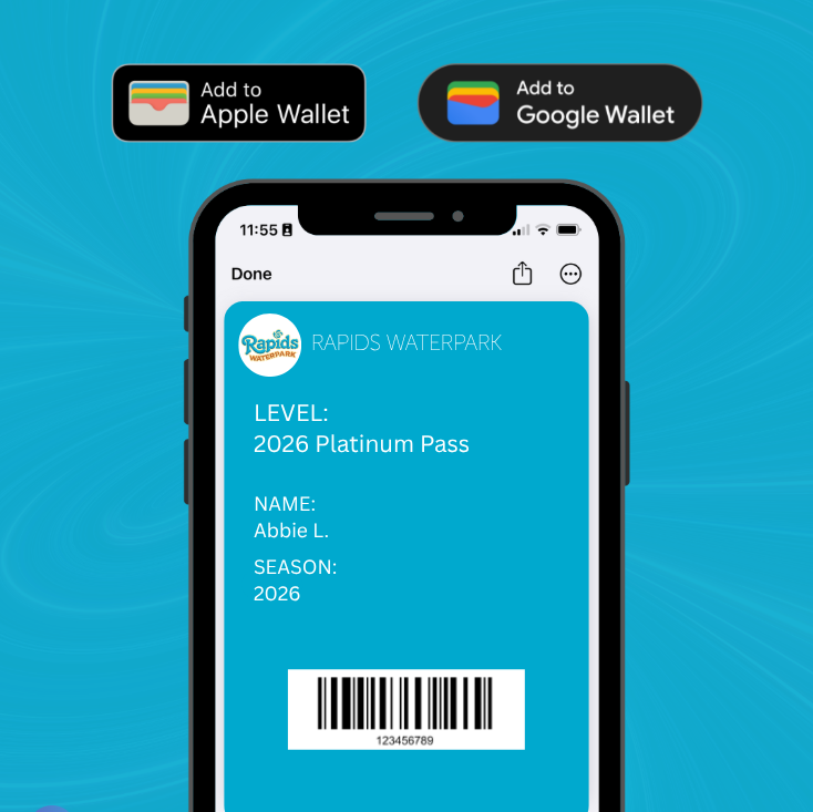 省去额外费用,一切从简——您的 Rapids 水上乐园 2026 年季票就是 全数字化 并且很容易通过 苹果钱包 or Google电子钱包。